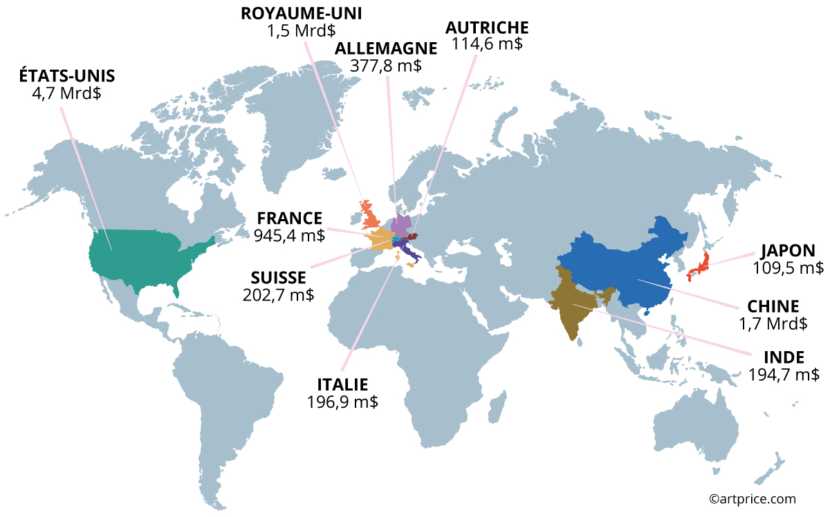 La France (+26 %) totalise 945 m$, soit 8,5 % du chiffre d'affaires mondial avec 131 650 lots vendus